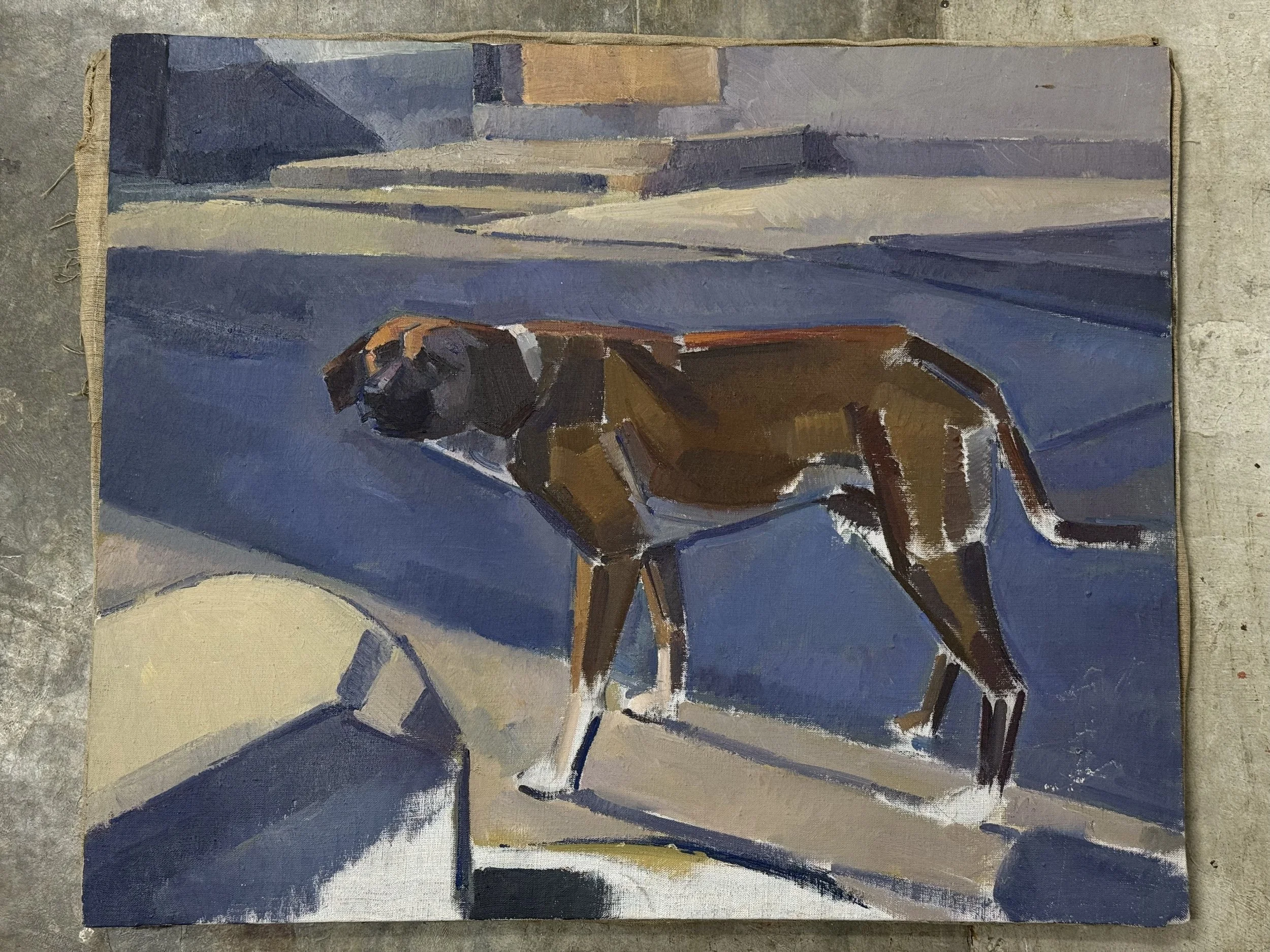 It was a few months ago that I saw a lost dog wandering the streets at night, sniffing along the pavement as if searching for its owner. A little further on I passed one of the rough sleepers who sometimes finds things he thinks I might like, exchanging them for a few euros to get him through the night. That night he handed me a painting: an oil painted canvas of a blue dog, beautifully executed and deeply melancholic. Not only was the subject of the painting a lost dog, but the painting itself now seemed lost too— a work with no trace of its maker. And so, without knowing how or why, it had come to rest with me.